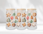 Christmas Cookie Frosted Glass Can β 16oz with Bamboo Lid and Straw, Holiday Drinkware Gift