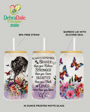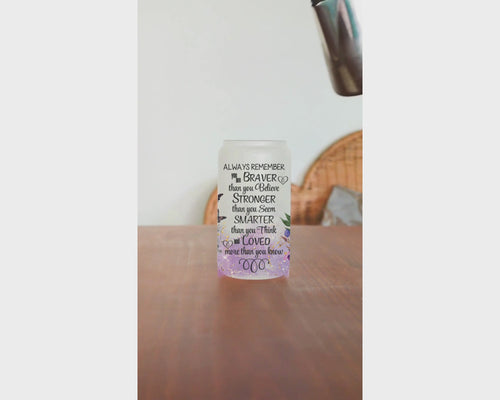Elevate your drinkware collection with the You Are Braver Than You Think 16 oz Frosted Glass Can Drinking Cup. This beautifully designed cup features an inspiring message surrounded by vibrant butterflies and flowers, perfect for adding a touch of positivity to your everyday beverage experience. Made from durable, high-quality frosted glass, it’s the ideal gift for anyone who could use a daily reminder of their inner strength and beauty. Whether for yourself or a loved one, this cup is sure to inspire and uplift.