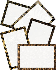 Elevate your notetaking and organization with our set of 250 elegant index cards. Crafted from premium 140# white index cardstock, these unlined cards provide durability and a smooth writing surface. Each card features one of five sophisticated black and gold border patterns, adding a touch of elegance to your notes. Packaged in an attractive box, these index cards are perfect for home, school, or office use, making a stylish addition to any stationery collection.