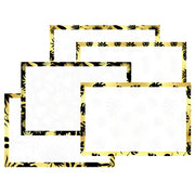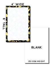 Introducing the Golden Tropics Blank Index Cards, where the lush vibrancy of tropical designs meets the timeless elegance of gold and black. This select 50-pack set showcases the bohemian charm with a luxe twist, featuring 4"x6" blank index cards each bordered by one of five exquisite tropical-inspired patterns. Each card is a work of art, printed on substantial 140# premium cardstock that feels as good as it looks. The unboxed collection makes for effortless accessibility and a simple, stylish approach to taking notes, crafting personalized messages, or sketching out your dreams. Perfect for artists, planners, and anyone drawn to the allure of a tropical paradise accented with a touch of gold (not metallic), these cards are proudly made in the USA. Let Golden Tropics be your go-to for messages that matter, notes that inspire, and creativity that shines.