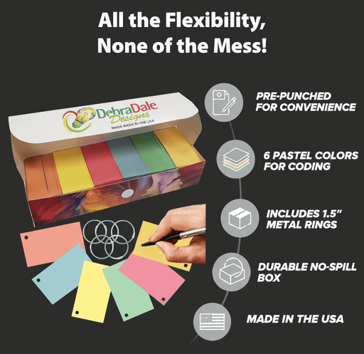 Extra Thick 100# Bright Cardstock Flash Cards - 4" x 3.5" - Three Colors - Single Hole Punched with Three Binder Rings - Bonus Travel Box